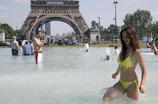 (法國發(fā)布橙色高溫預(yù)警,當(dāng)?shù)鼐用窈陀慰驮诎7茽栬F塔下玩水)