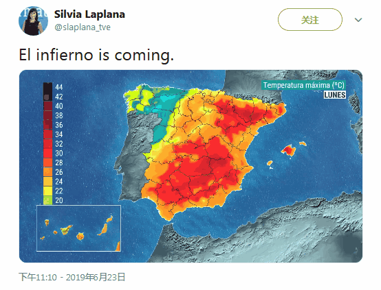 西班牙是本次受熱浪襲擊最嚴(yán)重的國家之一。據(jù)西班牙氣象部門預(yù)測(cè),該國大部分地區(qū)的氣溫都將達(dá)到至少36度,中部地區(qū)超過40攝氏度,部分地區(qū)可達(dá)42度。西班牙氣象學(xué)家西爾維婭·拉普拉娜(Silvia Laplana)24日發(fā)表推特稱:“地獄來了。”