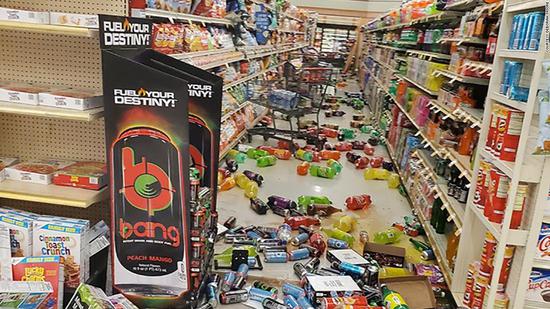 據(jù)美國(guó)地質(zhì)調(diào)查局地震信息網(wǎng)消息,本次地震發(fā)生于當(dāng)?shù)貢r(shí)間4日上午10時(shí)33分(北京時(shí)間5日1時(shí)33分),震中位于瑟爾斯谷西南12公里處,震源深度10.7公里。距離震中約270公里的洛杉磯和周邊城市有明顯震感,當(dāng)?shù)胤课輷u晃了10秒鐘左右。此次地震造成部分店鋪的商品從貨架倒塌,從現(xiàn)場(chǎng)圖看,不少飲料灑落一地。